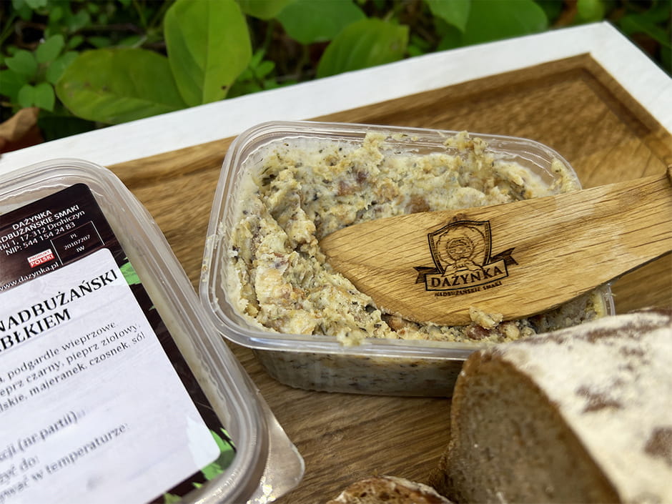 Nasz Smalczyk Nadbużański z jabłkiem to wyjątkowy produkt wytapiany ze słoniny wieprzowej z dodatkiem cebuli, jabłek i naturalnych przypraw. Smalczyk drohicki z jabłkiem to doskonały dodatek do wiejskiego chleba, idealny na biesiady i rodzinne spotkania. Charakteryzuje się wyrazistym, chłopskim smakiem, który przywołuje wspomnienia z dawnych lat. Bez konserwantów i sztucznych dodatków, jest naturalnym wyborem dla smakoszy tradycyjnych wyrobów.