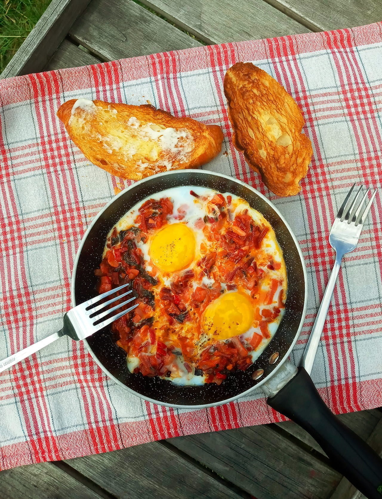 Zawartość słoika przekładacie na patelnię, podgrzewacie sos na mocnym ogniu, następnie drewnianą łyżką robicie w szakszuce wgłębienia i wbijacie w nie jajka, zmniejszacie gaz, przykrywacie patelnię i czekacie, aż białko się zetnie. Dzielicie danie na porcje i zajadacie z chlebkiem.